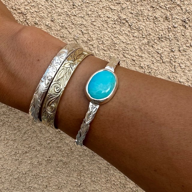 期間限定セール品!! 40,000→30,000円!! ターコイズ手彫りのシルバー925バングルです。 かなりお得な価格となっております。 2025年12月31日まで限定価格です。 ★シルバーについて 国産老舗貴金属会社より純度99.9%の純銀ささ吹きを仕入れております。 そこから彫金、エングレービング、仕上げております。すべてにおいてCaribbean Jewelry の職人が行っております。 ★茅ヶ崎ジュエリーについて 製作はもちろんのこと、茅ヶ崎の海や自然の中でインスパイアされたエネルギーが込められていています。 茅ヶ崎はホノルルと姉妹都市関係にあり、ハワイアンジュエリーの技法やデザインなど良いところを取り入れています。 【素材】 シルバー925、天然石ターコイズ 【大きさ】覆輪付ターコイズ 縦約14.9mm×横約20mm 厚み約5.3mm バングル部分14㎝ 開口25㎜ 【備考】素材の特性により、色や形、風合いなどが実際と若干異なる場合がございます。 天然石のため、黒点やインクルージョン、カケや傷が見られる石もございます。 予めご了承ください。