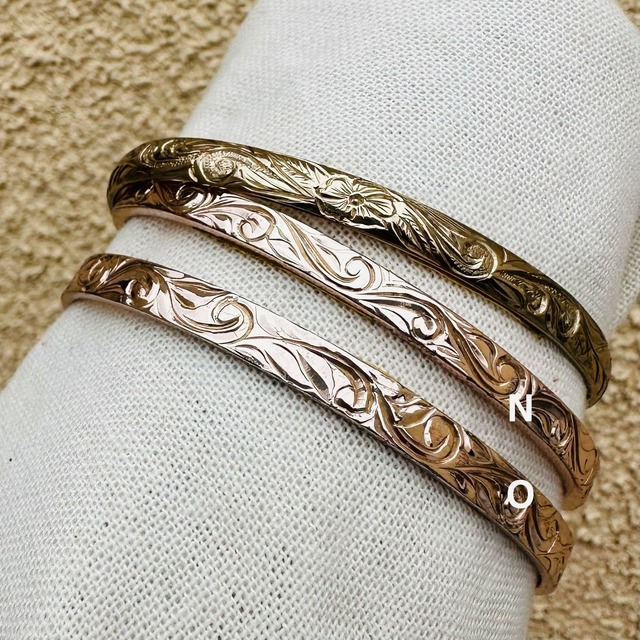 アウトレット品!! 手彫りのバングルです。 かなりお得な価格となっております。 2025年12月31日まで限定価格です。 真鍮、 セラミックコーティングをしております。 ★コーティングについて セラミッククリアー電着というコーティングを施しており、普通のシルバーと比べるとアレルギーの心配や酸化しての変色が少なくなっております。 また、シルバー金属の匂いもありません。 ★シルバーについて 国産老舗貴金属会社より純度99.9%の純銀ささ吹きを仕入れております。 そこから彫金、エングレービング、仕上げております。すべてにおいてCaribbean Jewelry の職人が行っております。 ★茅ヶ崎ジュエリーについて 製作はもちろんのこと、茅ヶ崎の海や自然の中でインスパイアされたエネルギーが込められていています。 茅ヶ崎はホノルルと姉妹都市関係にあり、ハワイアンジュエリーの技法やデザインなど良いところを取り入れています。 【素材】 真鍮 【大きさ】幅約9mm 厚み約1.8mm バングル部分14㎝ 開口30㎜ 【備考】素材の特性により、色や形、風合いなどが実際と若干異なる場合がございます。 予めご了承ください。