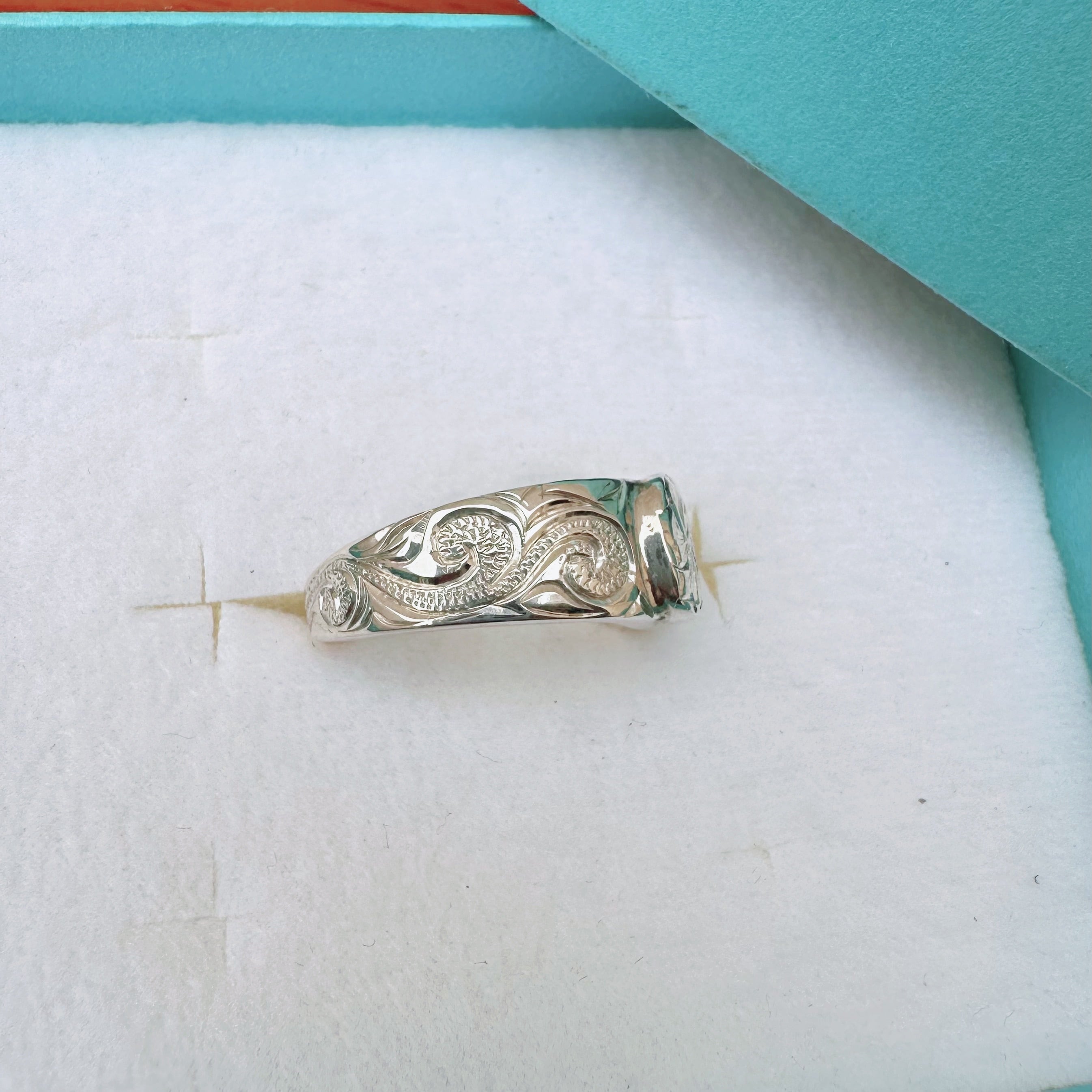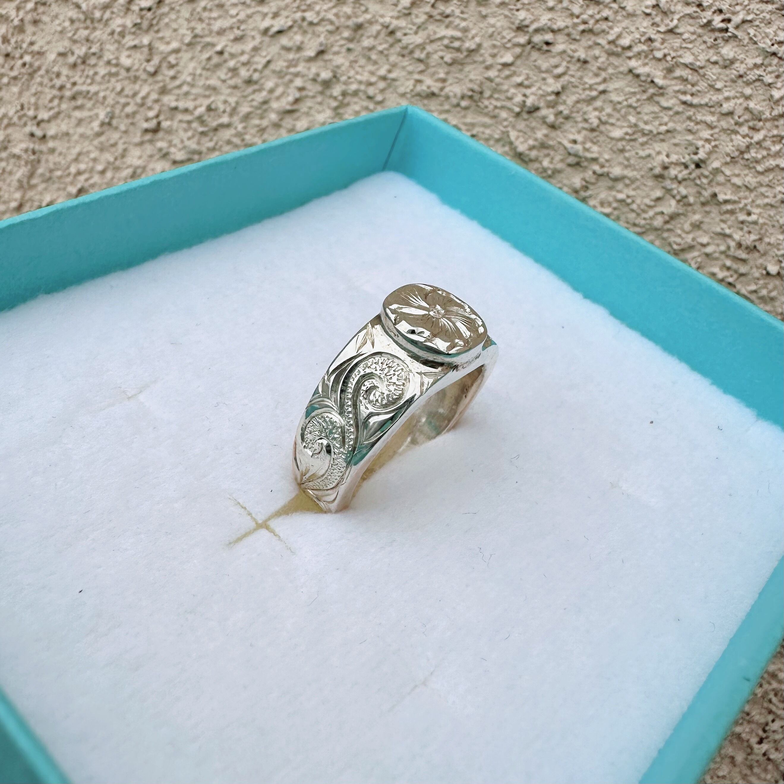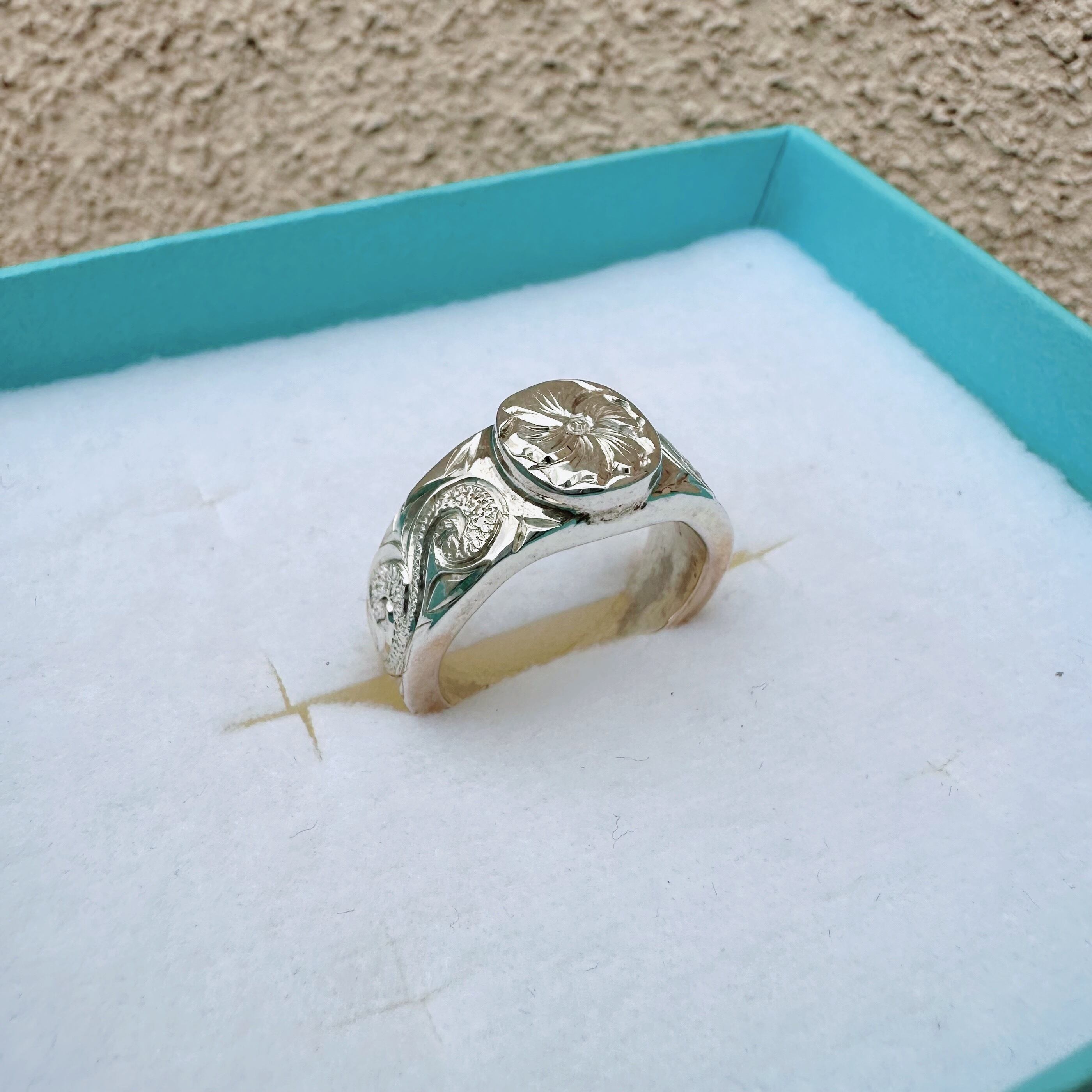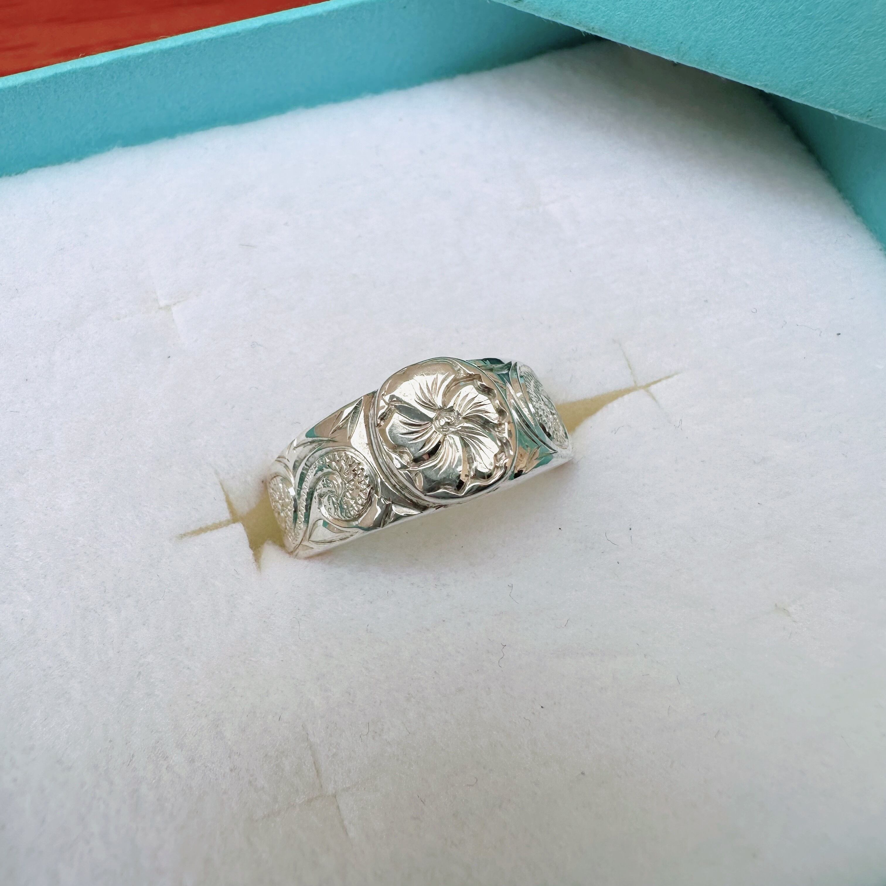 センターには丸いシルバーを台にプルメリアが彫り込まれており、